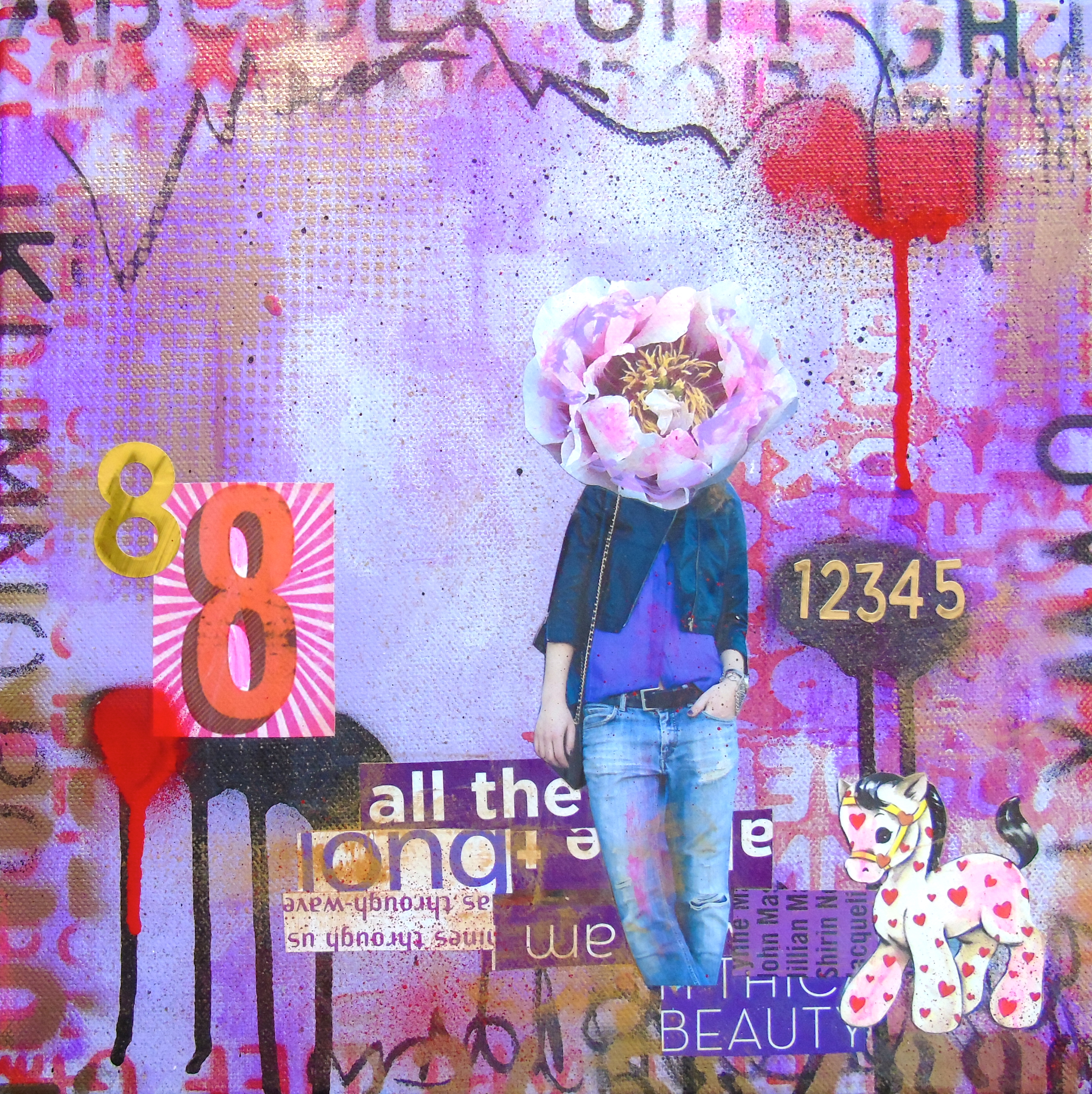 Lorette on her work: “My visual artwork reflects my eclectic curiosity about everything. Working with collage and a wide variety of mixed media allows me to experiment continually and explore the whole world, to make unexpected juxtapositions, to place ideas and elements together, and to take them apart. I’m inspired by poetry, beauty, people, art history, travel, humour, and colour. My artworks are vignettes of moments, often just a passing dream, meant to be read the way a poem is, that is, viscerally, for their strange beauty.”