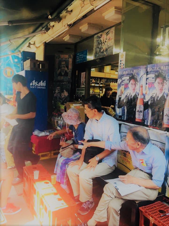 Outside Echigoya Honten, a liquor store on Yanaka Ginza, a busy shopping street. A local space where residents of Yanesen often gather to enjoy a cup of beer or sake and watch the crowds from the market go by, they are just as eager to welcome international visitors to sit on a crate beside them, oftentimes despite the lack of a common language