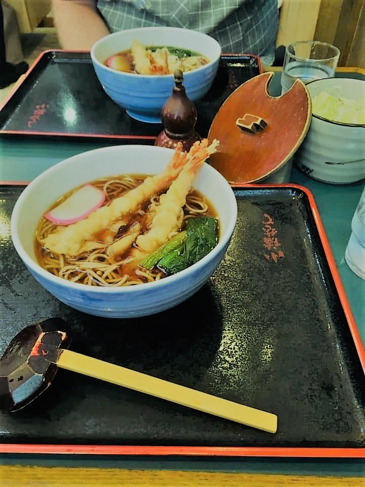 “Salaryman food.” All over the city there are places that cater to salarymen–food that is fast and cheap and oftentimes involves placing your order at a vending machine. We stumbled across this place and were interested in going in but there was no English menu, no pictures, nothing but Kanji written on the vending machine. We were about to give up and find somewhere else when the woman in charge of the shop ran out, ushered us in, produced a book of pictures, and then ordered them for us on the machine. The result was two perfect bowls of ebi tempura soba, for under $10 USD.