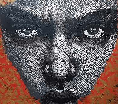 The first poem, “Lunar Rhapsody”, is an ekphrastic poem on artist Dr. Pamela Chrabieh’s painting (above) from her Engaging Gazes exhibition. The poem questions the thoughts and intentions hidden behind the lady’s feminine, furrowed brows…