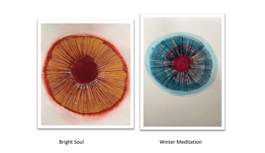 The initial image, a circular form and background, often requires up to three or four layers of intuitively applied paint, ink, pastels or a mixture. I love the nuanced nature of this part.