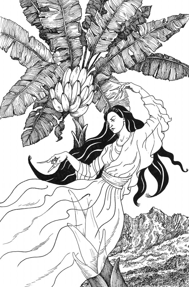 “The pontianak are beautiful, pale-skinned apparitions with long flowing hair. They live inside the trunks of the banana trees during the day, and, when they appear, they’re dressed all in white.”