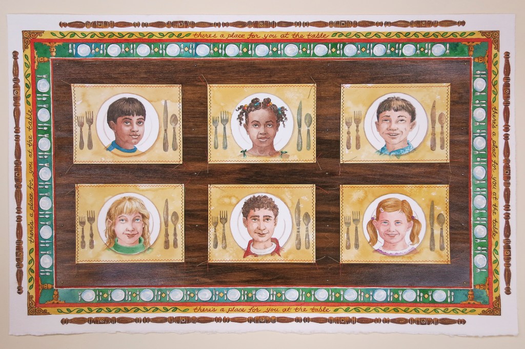 I created this mixed media piece was for a regional art exhibit whose theme was “Place,” a word which could be interpreted in any way by the artist. I thought about there being a ‘place at the table’ where people of all cultures/genders/religions can gather and get to know one another. My love of textiles can be seen in the machine stitching of the ‘place’mats and the decorative border bringing the whole piece to resemble a tablecloth.