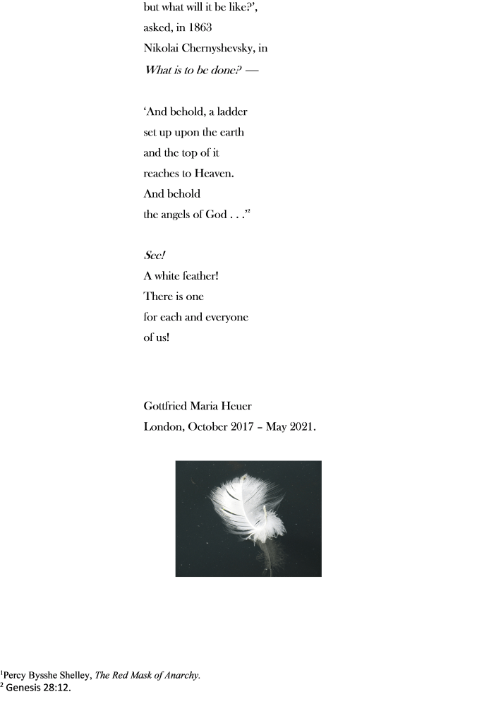 I am uncertain whether I’ll be able to ‘pull this off’, as they say, or are the two I have in mind just too disparate? Yet, after all . . . So, here it goes: There is a self-portait by Rembrandt from when he was old, and he looks at me, across the time of some 400 years . . . Behind him, on the wall, are two, yes, disparate segments of a circle, somewhat back to back, those two halves; the general understanding as to what they might mean, is a reference to the painter Giotto, some 400 years before: when asked to prove his artistic skill, he complied by drawing a perfect circle with a single fluent movement. There it is: the anecdote speaks of a single circle, yet in Rembrandts painting there are two parts of it, disparate – or . . . ? There is a certain place by the River Thames, not exactly a peninsula, but somewhat rounded by the vegetation growing on the shore – the river’s just beyond. Brambles, trees and bushes almost form a rounded alcove. This is where I and my Beloved enjoy to sit. And each time we go there a tiny robin comes to be with us – well, I guess, were sitting in his parlour . . . We feed him crumbs from our biscuits, having learnt that he likes them really, really small. But that’s not all: he looks at us, seems to be speaking eye-to-eye, and, to see us even better, he leaps about, then flies all around us, yes! in a circle which he completes in a single, fluent movement! And not just once, again, and yet again. No longer do we need to ask, ‘Will the circle be unbroken?’ As this, at last, finally, is the Age of Aquarius – since the last Winter Solstice, merely weeks ago! We are the ones we have been waiting for! And we are one, the two halves have been joined, the circle is complete in a single, fluent movement – not just the two of us, but you, and you, and you – you, too! And you! – We. Are. So. Many! Gottfried Maria Heuer, London, January/February 2021