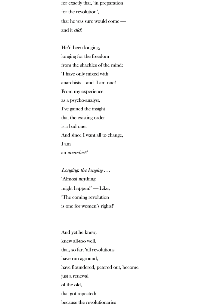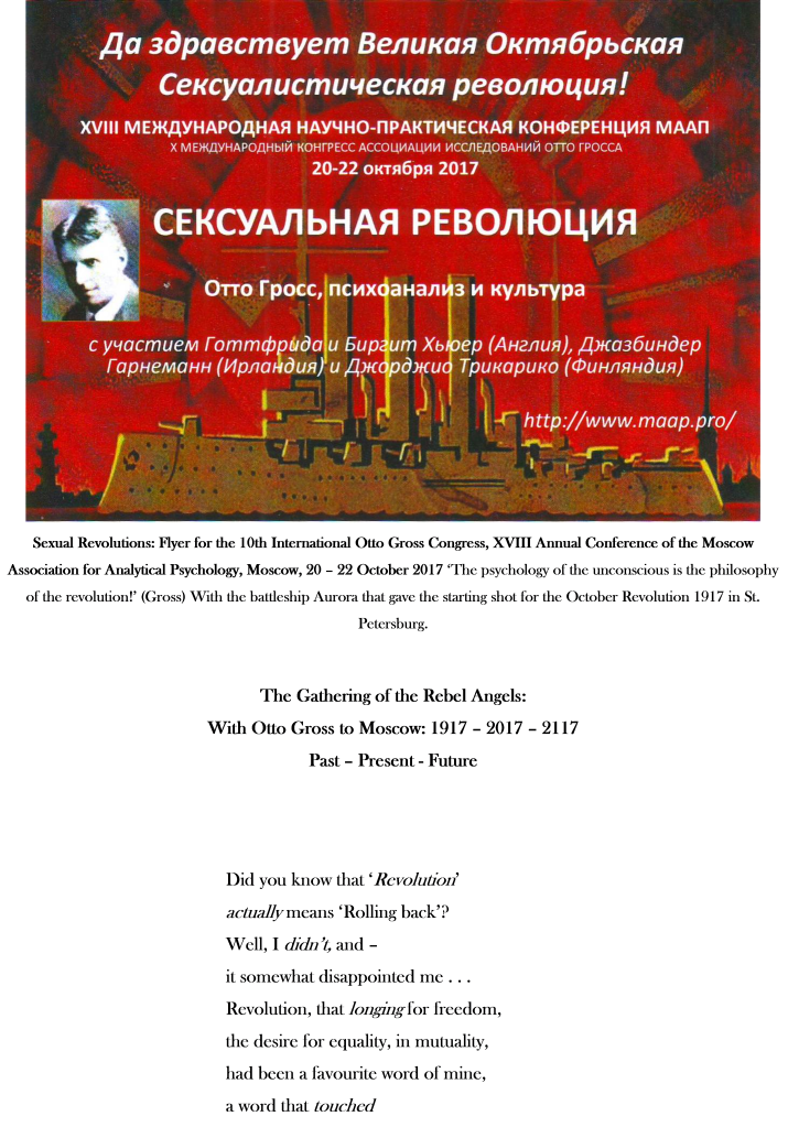 Otto Gross – 1977 – 1920 – was the first psychoanalyst to link analysis with revolutionary change, for which, at the time, he was made an outcast of the psychoanalytic endeavour. Yet he had a strong influence on both Freud, Jung, and many others. They ‘stole from him to adorn their own posteriors’ (Kuh, 1920): ‘A hundred years ago, he wrote the theory for the therapy of tomorrow’ (Madison, 2001). Gross’ colleagues exercised on him what the ancient Romans called damnatio memoriae – the damnation of memory: they tried to erase him from history. For some 25 years, I have helped to correct this with my research, in the course of which I founded the International Otto Gross Society (for which I [co-]edited some 5000 pages of congress proceedings), now the International Association for Gross Studies. My book is, Freud’s ‘Outstanding’ Colleague/Jung’s ‘Twin Brother’. The Suppressed Psychoanalytic and Political Significance of Otto Gross’ (London & New York: Routledge, 2017). – After congresses all over central Europe, the 10th one was in Moscow in 2017 – the 100th anniversary of the Russian Revolution. Gross, I imagine, would have enjoyed that – he died before everything in Russia went pear-shaped and worse . . .