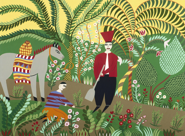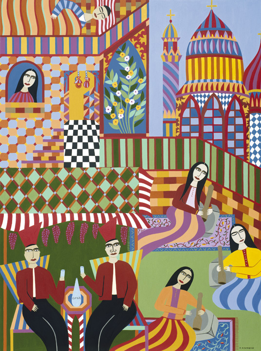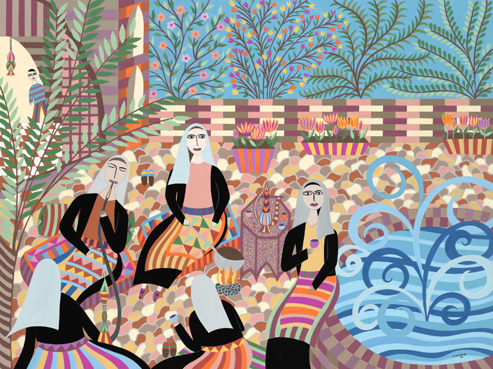 Helen Zughaib was born in Beirut, Lebanon, living mostly in the Middle East and Europe before coming to the United States to study art at Syracuse University, earning her BFA from the College of Visual and Performing Arts. Helen currently lives and works in Washington, DC, as an artist. She paints primarily in gouache and ink on board and canvas. More recently, she has worked with wood, shoes, and cloth in mixed media installations. Her work has been widely exhibited in galleries and museums in the United States, Europe and Lebanon. Her paintings are included in many private and public collections, including the White House, World Bank, Library of Congress, US Consulate General, Vancouver, Canada, American Embassy in Baghdad, Iraq, the Arab American National Museum in Detroit, Michigan, and the Minneapolis Institute of Art. Her paintings have been gifted to heads of state by President Obama and former Secretary of State, Hillary Clinton.