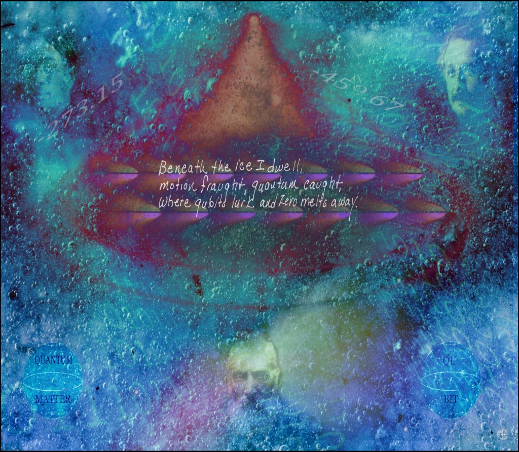 Design elements in this visual poem bring together all these aspects of absolute zero. Underlying all is an ice field in which bits and bytes are imprisoned. The coldest known spot in the cosmos, the Boomerang Nebula, is also present just behind Lord Kelvin’s image. Quantum computing and qubits are referenced at lower left and right. Central to the image is the wavelike Bose-Einstein Condensate. The poem, at the center of the condensate, evokes the overall design even suggesting that in quantum computing “zero melts away.”